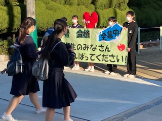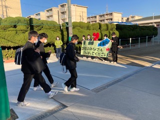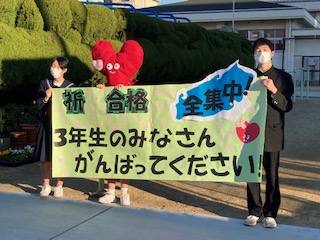 2月9日(火)の朝、子どもたちが登校してくる正門を入ったところで、生徒会執行部の子どもたちと長吉中学校マスコットキャラクターのこころんが横断幕を持って中学3年生のみなさんに「明日の私学入試、がんばってください」とエールを送っていました。