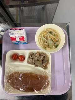 豚肉とごぼうの煮もの なにわうどん プチトマト