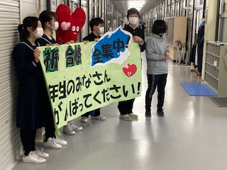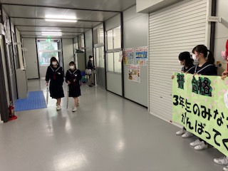 2月17日(水)の朝、生徒会執行部の子どもたちは18日、19日に行われます公立特別選抜入試に向けて応援の言葉を送りました。
