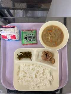 まぐろの甘辛焼き 豚汁 くきわかめのつくだ煮 ソフト黒豆 ごはん 牛乳