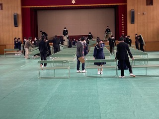 3年生は3月5日(金)より卒業式に向けて練習に入ります。その卒業式の練習に向けての準備を2年生が行いました。2年生は3年生を送り出す在校生代表として全員で張り出し舞台の設置、長椅子を出して配置する作業を行いました。
