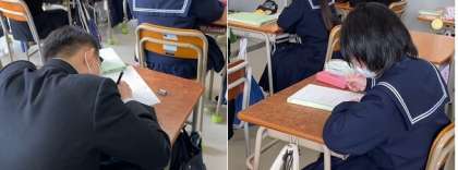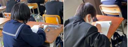3月4日(木)の6時間目、1年生は1年間のまとめとしてキャリアパスポートに振り返りを記入しました。中学1年生としての1年間の振り返りと2年生に備えて子どもたちは書き込みました。