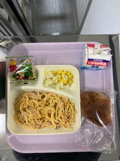 さけのクリームスパゲッティ カリフラワーとコーンのサラダ 豆こんぶ