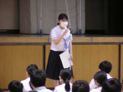 校長先生の講話に続き、生活指導の先生からのお話と生徒会から制汗剤や日焼け止めの使い方について説明がありました。