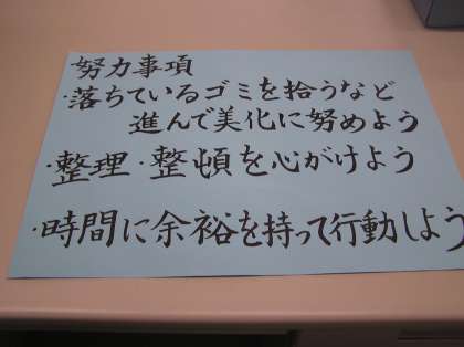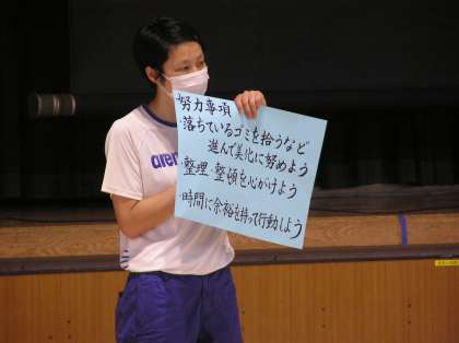 続いて生活指導の先生より話があり、具体的な生活での注意点や生活の中で気づいて欲しいことなどスクリーンを使いながら話をしました。それを基に設定された生活目標「校内の環境美化を整えよう」と努力事項の話がありました。