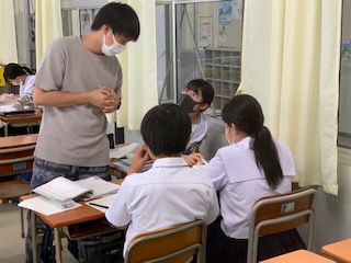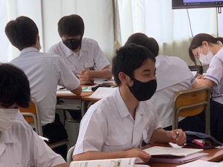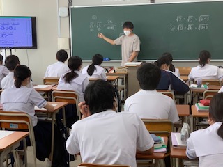 習熟度別分割授業を行っています。根号を含む式の乗法と除法について学びました。グループでは学び合う姿が見られました。最後に、振り返りをして次回の授業に備えます。