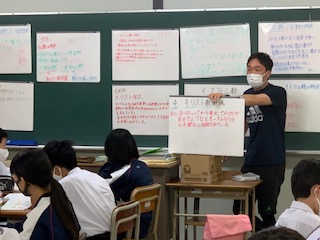 世界の三大宗教の分布、特色など調べてきたことをグループでまなボードにまとめ、それをもとに理解を深めました。