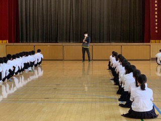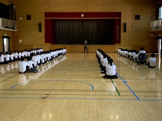 毎週金曜日は、3年生の定例集会です。遅れてくる生徒もなく時間を守り始まっています。今日は、松岡先生から夏休みを間近に控えて、学習に、部活動に、最上級生として、また個々の進路に向けてしっかり有意義に過ごしすようにとのお話しがありました。
