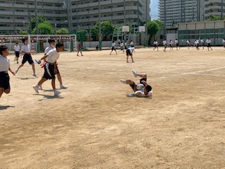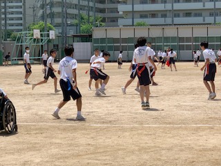 男女とも、タグラグビーの試合を行いました。軽快なステップで敵をかわし、トライをあげる生徒がおり、熱戦が繰り広げられました。