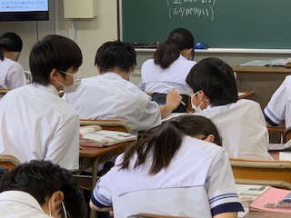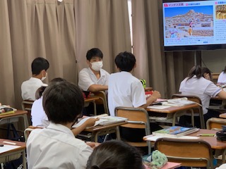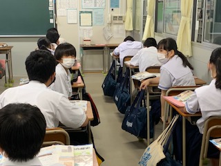 4限目、1年1組で中野先生の研究授業が行われました。緊急事態宣言下で、机をつけてのグループ学習は控えていますが、共有課題については隣同士で積極的に学び合う姿が見られます。最後に振り返りを行いました。