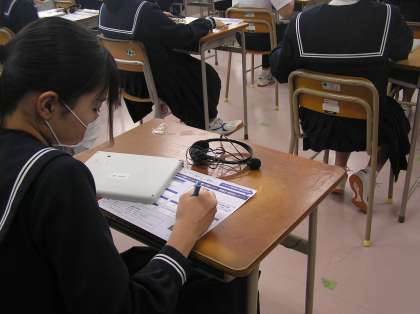 3年生は英語力調査(GTEC)を行いました。リーディングテスト、リスニング・ライティングテスト、スピーキングテストを3時間に分けて実施しました。スピーキングテストではタブレットを使い、それぞれの生徒がマイクに向かって答えます。新しいテストの形態です。