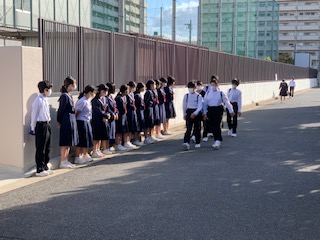 秋空の爽やかな今日、いつもの朝の登校風景です。たくさんのボランティアの生徒も参加して元気な挨拶を交わしています。