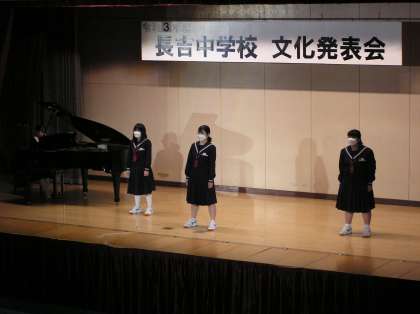まずは合唱部です。映画「アラジン」より「アホールニューワールド」、ミュージカル「アニー」より「トゥモロー」を歌いました。3人という少人数のクラブですが、会場に響き渡る声で歌っていました。正門まで響き渡っていたそうです。