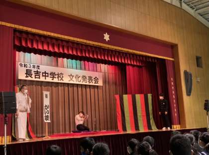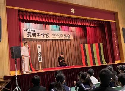 体験コーナーでは三年生の泉さんと中川さんが舞台上に上がって落語の動きに挑戦しました。