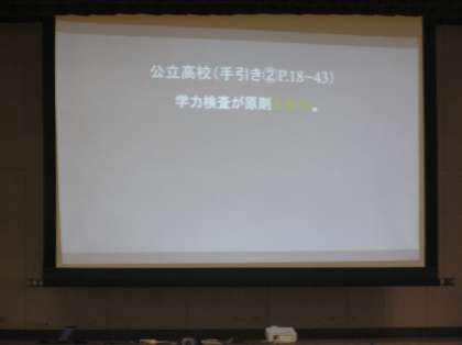 進路に関する日程や入学者選抜制度の説明などを行いました。欠席された方には生徒を通じ資料をお配りいたします。