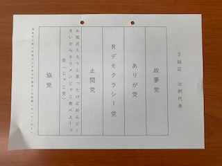 各班で政党を結成し、代表者を決め、基本的政策【憲法改正、原子力発電、消費税】と目玉政策について発表しました。どの政党(班)もしっかり下調べし自分たちの理念、政策をしっかり訴えて活気ある演説会となりました。その後、代表者が衆議院議員小選挙区候補者として、各班が結成した政党が衆議院議員比例代表選挙として投票を行いました。これを機に政治への関心が少しでも深まってくれればと思います。
