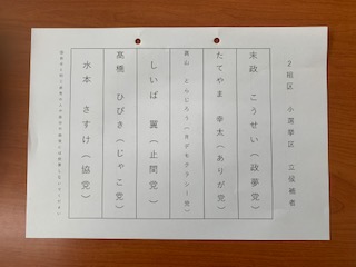 3年生にとっては3年後選挙権をもち国政に参加する立場となります。そこで2組の社会科公民分野の授業で模擬選挙を行いました。