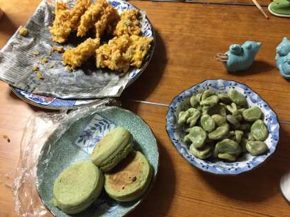 こちらの民泊の夕食メニューは今川焼(よもぎ入り)かき揚げ(トウモロコシ)そらまめ等です。