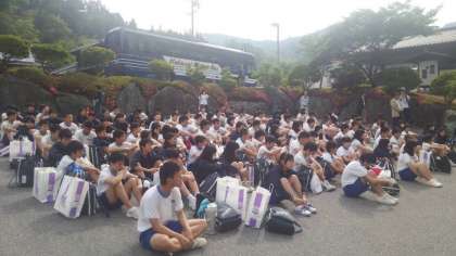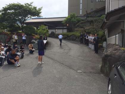お世話になった「ユルイの宿 恵山」での退館式の様子です。