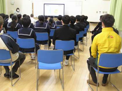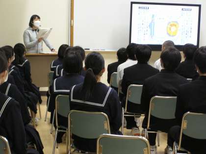 松尾先生のおばあさんの被爆体験を松尾先生から話しました。臨場感のある話で生徒が真剣に聞いているのはもちろん、戦争や原子爆弾の悲惨さ、その後も続く苦しみについて考える機会になりました。現実に日本で起こったことに自分自身の身近なこととして感じることができました。