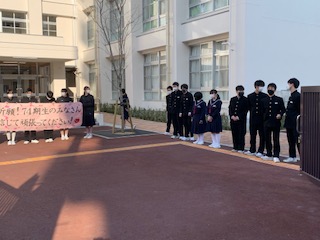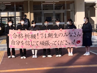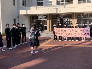 3年生は、明日公立一般の入試があります。生徒会役員と1、2年の学級委員、バレーボール部員らが、登校してくる3年生に、「がんばってください」とエールを贈りました。3年生のみなさん、ここまで努力してきたものを明日全て出し切る決意で臨んでください。応援しています。