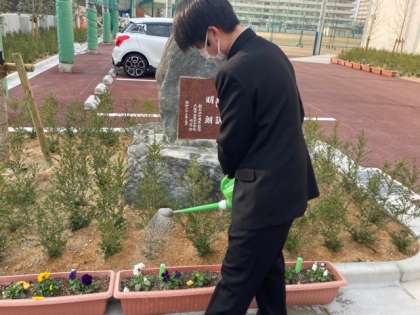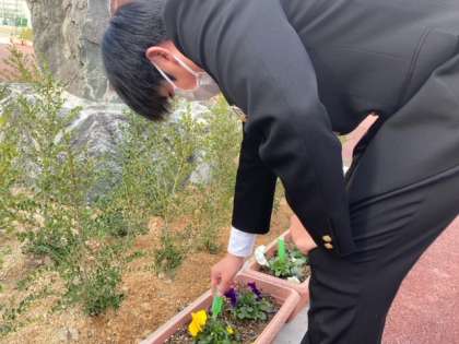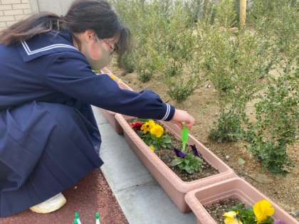 環境委員会では毎朝、花の水やりを行なっています。今日はパンジーが元気になるように、花壇に活力剤を挿してくれました。