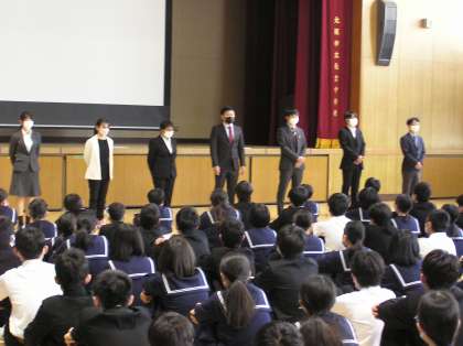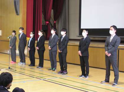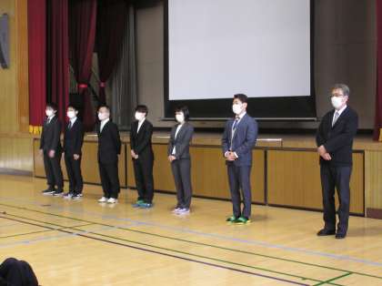 集会に先立ち、先週金曜日にできなかった、先生たちとの対面による紹介を実施しました。学年ごとの先生方です。よろしくお願いします。