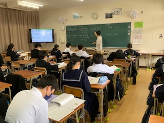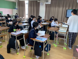 2組は家庭科です。作製したカバンの振り返り作業に取り組んでいます。製作過程での感想、反省やミシンの作業動画を取り入れたり、タブレットを使ってパワーポイントにまとめています。