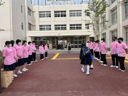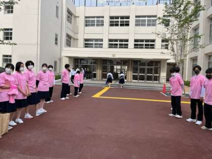 5月9日の"いじめについて考える日"に向けて、カナダで始まったピンクシャツデイといういじめに反対する運動にちなんで、議会メンバーで長中オリジナルピンクシャツを着てあいさつ運動を行いました。ピンクのTシャツを着て、いじめ反対の意思表示をします。Tシャツには"No bully"と描かれており、"いじめっ子なし"という意味です。その横には長中オリジナルキャラであるこころんのモチーフが描かれています。