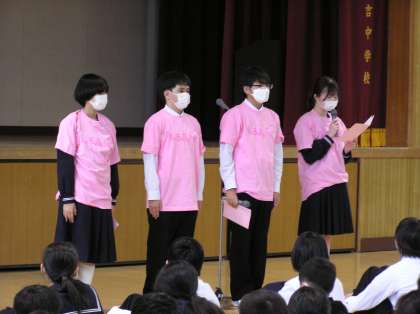 正解は2です。いじめは生きるために一番大切な脳を攻撃するので、食べれない・眠れない、そして口もきけなくなり命を失うことになるのです。ですから、みなさんをいじめられる人にしてはいけないし、いじめをする人にもしてはいけないと強く思っています。みなさん一人ひとりが、この長吉中学校を笑顔あふれるいじめのない安心・安全な学校にこれからもしていくんだという気持ちを持ち続けくれる事を願っています。また、先生方もこれからも長吉中学校をいじめのない学校にしていくために力を尽くします。最後に『いじめ撲滅宣言』をおこないます。