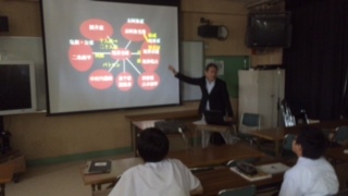 本日はMOA美術館の元学芸員の方に来ていただいて、2年生の社会科の授業で連携授業を実施しました。授業は歴史的分野、江戸時代の「元禄文化」の内容で、尾形光琳の「紅白梅図屏風」の実物大レプリカ作品をお持ちいただいての授業でした。