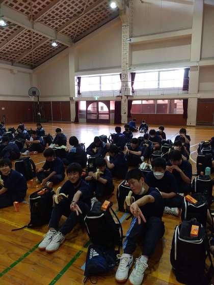 補食のバナナとジュースを食べています。この後の活動に向けて栄養補給です。