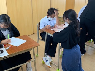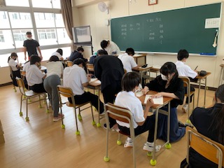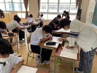 1年生は、数学です。数学科の教員3名と学年所属教員で、理解度に応じて3分割で実施しました。わからないところを先生がマンツーマンで説明しています。また、子ども同士の学び合いがみられました。