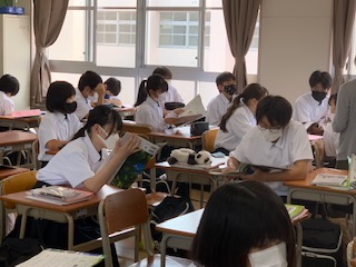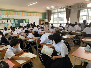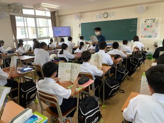 2限目1年2組で、英語の参観授業が行われました。ペアになっての読み練習、カーペンターズのsingを歌唱、文法の導入をモニターを利用して行いました。