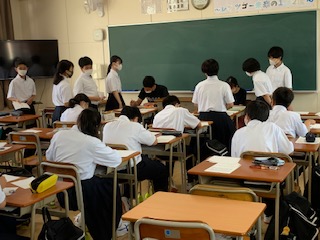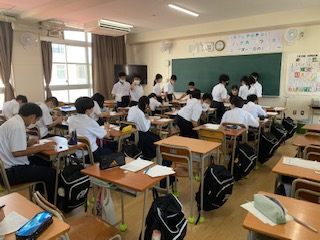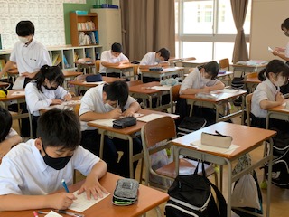 1年生は国語です。漢検特7級、6級への挑戦です。全問正解したものから次々に問題プリントをすすめていきます。