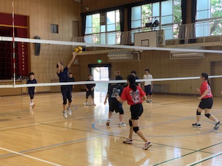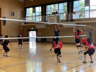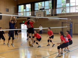 男女バレーボール部です。明るく元気に練習しています。男子は1年生が多いとあって、たくさんの好(珍?)プレーがあり、上手く強くなるんだという意気込みが感じられる練習でした。Tシャツにもある「笑顔満点」でこれからも頑張れ!