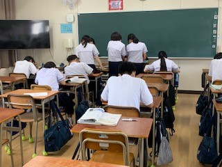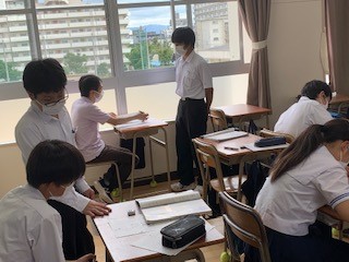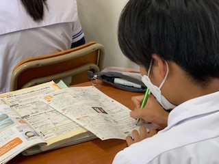 2年生は理科です。3分割で行いました。演習問題をする2クラスと元素記号の満点習得のクラスです。満点目指して19回目の挑戦です、頑張れ!