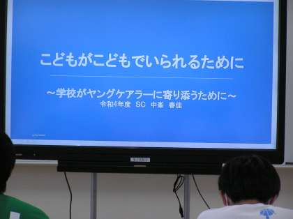 ヤングケアラーの現情や何を必要とされているのか。教員として学校として必要な対応は何なのか。ヤングケアラーの課題についてスクールカウンセラーの先生からから講話をいただきました。大変有意義な研修になりました。