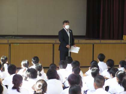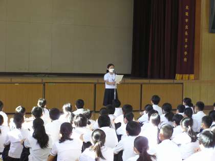 今週金曜日は体育大会です。練習にさらに熱が入る毎日になると思いますが、ケガのないように準備してください。そして当日は、それぞれが出場する個人競技で自分の最大限の頑張りを見せてください。例えば、いつもは100mを20秒かかる人が必死に18秒で走ったとき、たとえ順位は最下位であっても見ている人たちに大きな感動を与えてくれます。