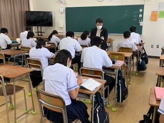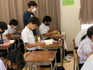 大阪市教育委員会から堀田千秋総括指導主事先生に来ていただき、リーディングスキルテストの視点を生かした授業づくり・実践をお願いしました。今日と来週11日の2回、3年生の国語の授業を行っていただきます。今日は魯迅の「故郷」の第1限目です。中学校で学ぶ文学作品のなかでは一番難しいとされるもので、堀田先生による範読の後、わからない言葉や表現、文章の意味、感想、疑問、気づいたことを配布されたプリントに各自で列記していく活動をしました。生徒への質問や指示の投げかけ方、起こるべき事柄を示して未然に考えさせることなど、参観させていただいた先生方に大変勉強になりました。