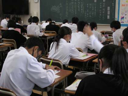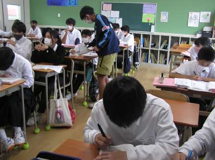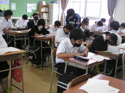 1年1組国語の授業です。文を文節に分け、さらにその文節がどのようなはたらきをしているのか文の成分について学習しました。主語・述語・修飾語・接続語・独立後などに分けていきます。問題を解きながら一生懸命に考えていました。分からないところは友達と教え合いながら取り組みました。先生と一緒に答え合わせをしたときは、難しい問題で正解または不正解のたびに生徒達の喜びの声やため息が聞こえました。