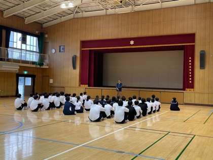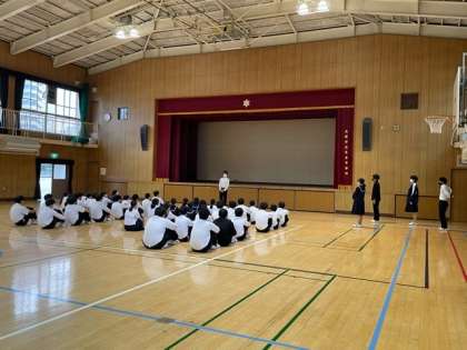 定例の3年学年集会がありました。学年主任の岩井先生から、あっと驚いた事として、「受験に向かって意識が変わってきていること。」「人には欠点があるが、見方によっては長所になること。」「体育大会でとても感動し、この力を文化発表会にも期待しています。」とお話がありました。