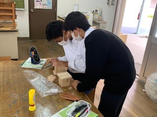 1組は、技術作業室で木材加工の単元としてペン立てを作製しています。なかには釘を打つのが初めての生徒もおり、四苦八苦しながらも仕上げ作業へと黙々と進めていました。出来上がりが楽しみです。