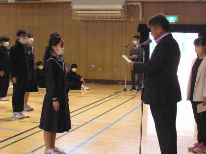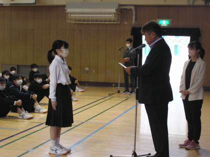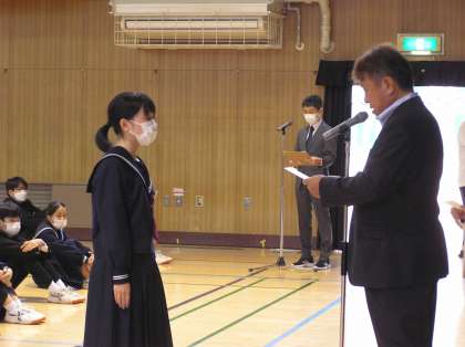 全校集会に先立ち後期学級委員認証式を行いました。各学年の代表者が認証状を校長先生から受け取りました。それぞれの立場で学級の代表として活躍を期待しています。自分の役割をしっかりと果たしていくことで、長吉中学校がより良く、また盛り上がっていきます。よろしくお願いします。
