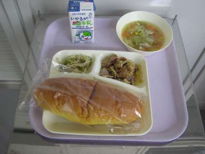 今日の献立はパン、牛乳、豚肉のカレー風味焼き、はくさいのスープ、もやしとピーマンのいためものです。