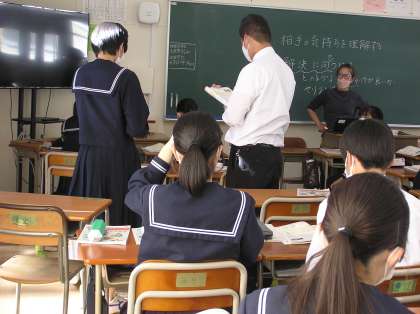3年生の家庭科の様子です。「相手の気持ちを理解する」をテーマとして、保護者とのかかわり方や言葉の選び方、その時の相手の気持ちを考えました。生徒に保護者役と中学生役を割り当てロールプレイングしながら授業が進んでいきました。それぞれの立場の気持ちを考えることで家族の中での態度を振り返ることができていました。