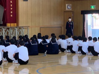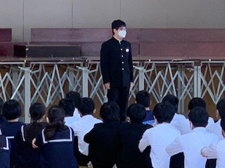学年代表の高橋君から「アイデアや発表する機会がふえてきます。学校の中核として何事にも積極的に取り組んでいきましょう」と呼びかけがあり、日下部先生から「自分は何を伝えたいのか、そのために相手に伝わる声、表現、想いを考えましょう」「合唱コンクールでの注意点審査基準について」お話しがありました。