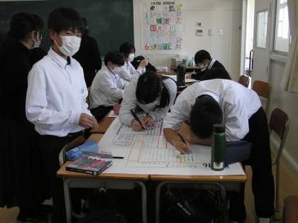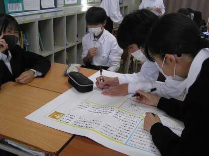 班ではSDGsについてタブレットで調べる生徒や壁新聞に下書きする生徒、下書きを仕上げる生徒など役割を分担しながら進めています。