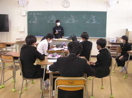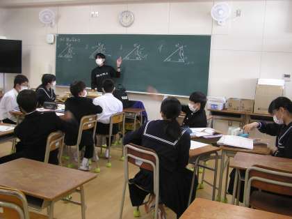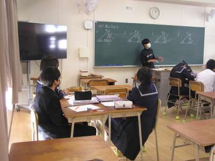 今日の授業は多角形の角の大きさについて学習しました。様々な多角形の角度についていろいろな求め方があることや考え方を変えて求めることで工夫することが可能であることなどを学習しました。生徒たちは自分が考えた求め方とは違う方法を教わり、新たな気づきがあったようです。
