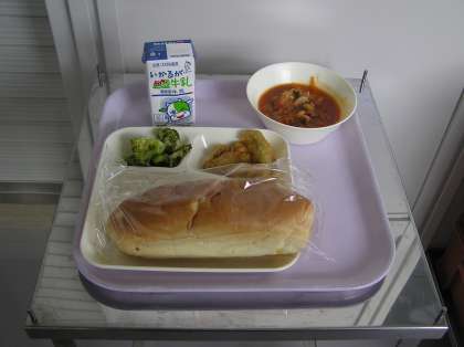 今日の献立はパン、牛乳、白身魚フリッター、ミネストローネ、ブロッコリーのサラダです。